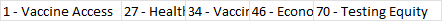 1 Vaccine Access 75 Access to care 47 Immunization Clinic 58 Digital Divide 48 School Closures 46 Economic impact 17 Outreach Programs 72 Supply Chains 40 PPE 16 Disportioate Impact 27 Health Insurance 34 Vaccine rates 7 Vaccine Hesitancy 55 Public Awareness 3 Mask Mandates 69 Vaccine Myths 32 Disparity Data 70 Testing Equity 18 Mental Health 9 Essential Workers 4 Health Equity 38 Subsidze Care 20 Public Health 44 Education Programs 71 Childcare Gaps 1 Vaccine Access 75 Access to care 47 Immunization Clinic 58 Digital Divide 48 School Closures 46 Economic impact 17 Outreach Programs 72 Supply Chains 40 PPE 16 Disportioate Impact 27 Health Insurance 34 Vaccine rates 7 Vaccine Hesitancy 55 Public Awareness 3 Mask Mandates 69 Vaccine Myths 32 Disparity Data 70 Testing Equity 18 Mental Health 9 Essential Workers 4 Health Equity 38 Subsidze Care 20 Public Health 44 Education Programs 71 Childcare Gaps