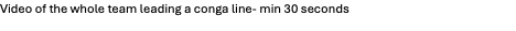 Video of the whole team leading a conga line- min 30 seconds and 10 people