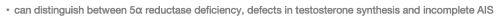 can distinguish between 5α reductase deficiency, defects in testosterone synthesis and incomplete AIS