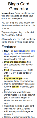 (Print) Use this randomly generated list as your call list when playing the game. There is no need to say the BINGO column name. Place some kind of mark (like an X, a checkmark, a dot, tally mark, etc) on each cell as you announce it, to keep track. You can also cut out each item, place them in a bag and pull words from the bag.