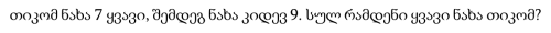 თიკომ ნახა 7 ყვავი, შემდეგ ნახა კიდევ 9. სულ რამდენი ყვავი ნახა თიკომ?