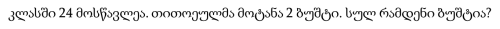 კლასში 24 მოსწავლეა. თითოეულმა მოტანა 2 ბუშტი. სულ რამდენი ბუშტია?