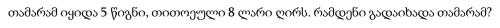 თამარამ იყიდა 5 წიგნი, თითოეული 8 ლარი ღირს. რამდენი გადაიხადა თამარამ?