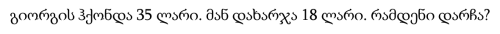 გიორგის ჰქონდა 35 ლარი. მან დახარჯა 18 ლარი. რამდენი დარჩა?