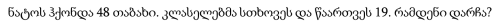 ნატოს ჰქონდა 48 თაბახი. კლასელებმა სთხოვეს და წაართვეს 19. რამდენი დარჩა?