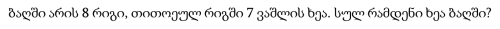 ბაღში არის 8 რიგი, თითოეულ რიგში 7 ვაშლის ხეა. სულ რამდენი ხეა ბაღში?