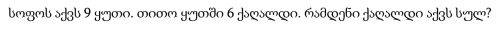 ტორტი დაყვეს 8 ნაჭრად. თითო ნაჭერი ღირს 6 ლარი. რამდენი ღირს მთელი ტორტი? ლევანმა ბურთი ისროლა კარში 20-ჯერ. 13-ჯერ გაარტყა. რამდენჯერ ვერ გაარტყა? მანუჩარმა დღეში 5 გვერდი წაიკითხა. 6 დღეში რამდენი გვერდი წაიკითხა? მათემატიკის გამოცდაზე მაქსიმალური ქულაა 100. ირმამ მიიღო 87. რამდენი ქულა დააკლდა? ბაღში არის 8 რიგი, თითოეულ რიგში 7 ვაშლის ხეა. სულ რამდენი ხეა ბაღში? გიორგის ჰქონდა 35 ლარი. მან დახარჯა 18 ლარი. რამდენი დარჩა? ანამ ანამ იყიდა 4 კალამი 3 ლარად თითო. რამდენი ლარი გადაიხადა? სოფოს აქვს 9 ყუთი. თითო ყუთში 6 ქაღალდი. რამდენი ქაღალდი აქვს სულ? ნატოს ჰქონდა 48 თაბახი. კლასელებმა სთხოვეს და წაართვეს 19. რამდენი დარჩა? მარიმ იყიდა 3 შეკვრა ფანქარი, თითოეულში 10 ფანქარია. რამდენი ფანქარი აქვს მარის თამარამ იყიდა 5 წიგნი, თითოეული 8 ლარი ღირს. რამდენი გადაიხადა თამარამ? დავითს ჰქონდა 50 ლარი. მან იყიდა სათამაშო 32 ლარად. რამდენი ლარი დარჩა დავითს? კლასში არის 6 მერხი და ყოველ მერხზე ზის 4 ბავშვი. რამდენი ბავშვია კლასში? თიკომ ნახა 7 ყვავი, შემდეგ ნახა კიდევ 9. სულ რამდენი ყვავი ნახა თიკომ? ბიბლიოთეკაში იყო 120 წიგნი. 45 წიგნი აიღეს მოსწავლეებმა.. რამდენი წიგნი დარჩა? კლასში 24 მოსწავლეა. თითოეულმა მოტანა 2 ბუშტი. სულ რამდენი ბუშტია? ტორტი დაყვეს 8 ნაჭრად. თითო ნაჭერი ღირს 6 ლარი. რამდენი ღირს მთელი ტორტი? ლევანმა ბურთი ისროლა კარში 20-ჯერ. 13-ჯერ გაარტყა. რამდენჯერ ვერ გაარტყა? მანუჩარმა დღეში 5 გვერდი წაიკითხა. 6 დღეში რამდენი გვერდი წაიკითხა? მათემატიკის გამოცდაზე მაქსიმალური ქულაა 100. ირმამ მიიღო 87. რამდენი ქულა დააკლდა? ბაღში არის 8 რიგი, თითოეულ რიგში 7 ვაშლის ხეა. სულ რამდენი ხეა ბაღში? გიორგის ჰქონდა 35 ლარი. მან დახარჯა 18 ლარი. რამდენი დარჩა? ანამ ანამ იყიდა 4 კალამი 3 ლარად თითო. რამდენი ლარი გადაიხადა? სოფოს აქვს 9 ყუთი. თითო ყუთში 6 ქაღალდი. რამდენი ქაღალდი აქვს სულ? ნატოს ჰქონდა 48 თაბახი. კლასელებმა სთხოვეს და წაართვეს 19. რამდენი დარჩა? მარიმ იყიდა 3 შეკვრა ფანქარი, თითოეულში 10 ფანქარია. რამდენი ფანქარი აქვს მარის თამარამ იყიდა 5 წიგნი, თითოეული 8 ლარი ღირს. რამდენი გადაიხადა თამარამ? დავითს ჰქონდა 50 ლარი. მან იყიდა სათამაშო 32 ლარად. რამდენი ლარი დარჩა დავითს? კლასში არის 6 მერხი და ყოველ მერხზე ზის 4 ბავშვი. რამდენი ბავშვია კლასში? თიკომ ნახა 7 ყვავი, შემდეგ ნახა კიდევ 9. სულ რამდენი ყვავი ნახა თიკომ? ბიბლიოთეკაში იყო 120 წიგნი. 45 წიგნი აიღეს მოსწავლეებმა.. რამდენი წიგნი დარჩა? კლასში 24 მოსწავლეა. თითოეულმა მოტანა 2 ბუშტი. სულ რამდენი ბუშტია?