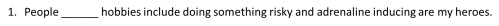 People ______ hobbies include doing something risky and adrenaline inducing are my heroes.
