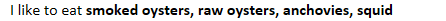 I like to eat smoked oysters, raw oysters, anchovies, squid