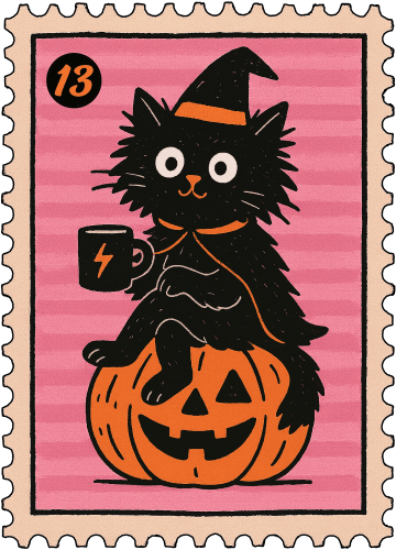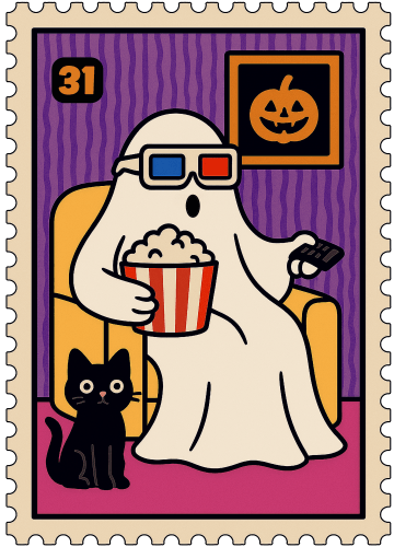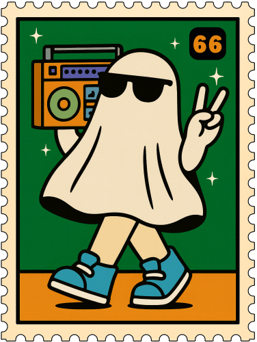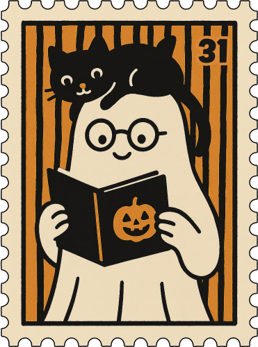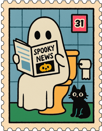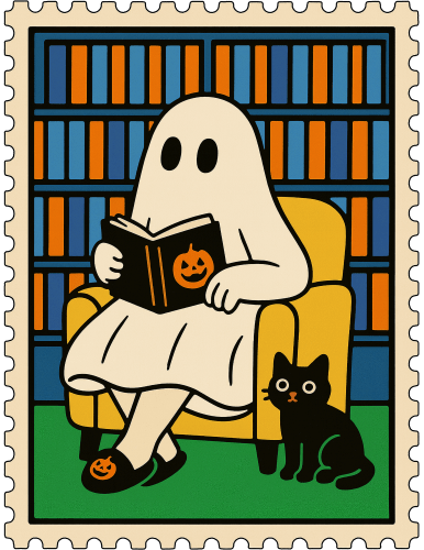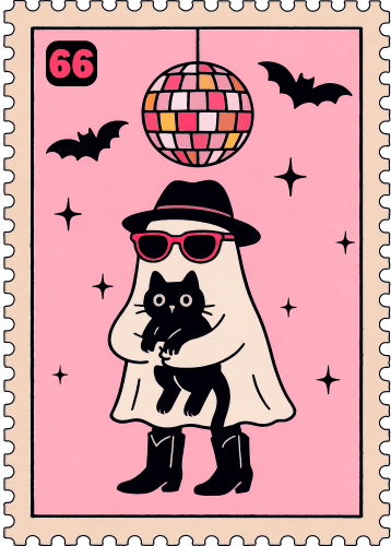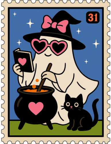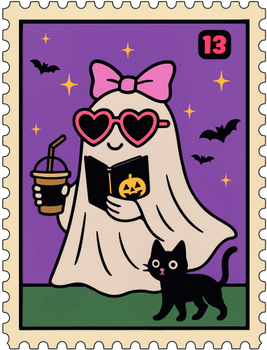 a ghost with a bow and heart-shaped glasses, drinking iced coffee