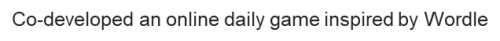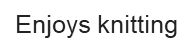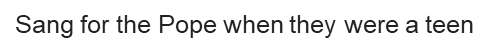 Alwayswears oddsocksAntonyOwneda pizzashopJessCo-developedan online dailygame inspiredby WordleAntonyTried to flylikeSupermanJessAdventuredthe WestCoast ofTurkey for 3weeks – solo!ReelHavebeen skydivingJessEnjoysknittingStephConstructeda family treedating backto 1640AntonyCompeted ina worldchampionshipcompetitionAnnaHave eatenraw jellyfish(in arestaurant)JessBelievestoilet lid ANDseat shouldbe down forgirls & boysAnnaMakes ameanMoroccanlamb tagineReelEarnedthe nickname “thesnacker”AnnaMarried andhoneymoonedin ItalyStephFave activityas a kid wasplaying picnicin parentsbedroomAnnaOwner orrecipewebsite with>150 recipesAntonyBiginternationalrugby fanStephRuns abookclubAntonySolotravelled theWesternScottishIslesReelUsed tohave apiercedtongueJessCannot bake(even whenfollowing therecipe)AnnaHavebeenbungeejumpingStephCan only playone song theguitar (WishYou Were Here– Pink Floyd)ReelFirstlanguageis ArabicReelSang forthe Popewhen theywere a teenStephAlwayswears oddsocksAntonyOwneda pizzashopJessCo-developedan online dailygame inspiredby WordleAntonyTried to flylikeSupermanJessAdventuredthe WestCoast ofTurkey for 3weeks – solo!ReelHavebeen skydivingJessEnjoysknittingStephConstructeda family treedating backto 1640AntonyCompeted ina worldchampionshipcompetitionAnnaHave eatenraw jellyfish(in arestaurant)JessBelievestoilet lid ANDseat shouldbe down forgirls & boysAnnaMakes ameanMoroccanlamb tagineReelEarnedthe nickname “thesnacker”AnnaMarried andhoneymoonedin ItalyStephFave activityas a kid wasplaying picnicin parentsbedroomAnnaOwner orrecipewebsite with>150 recipesAntonyBiginternationalrugby fanStephRuns abookclubAntonySolotravelled theWesternScottishIslesReelUsed tohave apiercedtongueJessCannot bake(even whenfollowing therecipe)AnnaHavebeenbungeejumpingStephCan only playone song theguitar (WishYou Were Here– Pink Floyd)ReelFirstlanguageis ArabicReelSang forthe Popewhen theywere a teenSteph