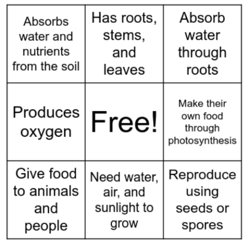 ProvideshadeReproduceusingseeds orsporesProducesoxygenAbsorbwaterthroughrootsHas roots,stems,andleavesMake theirown foodthroughphotosynthesisAbsorbswater andnutrientsfrom the soilGive foodto animalsandpeopleProvideshadeReproduceusingseeds orsporesProducesoxygenAbsorbwaterthroughrootsHas roots,stems,andleavesMake theirown foodthroughphotosynthesisAbsorbswater andnutrientsfrom the soilGive foodto animalsandpeople