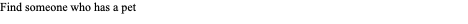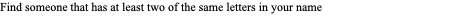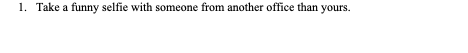 Findsomeonewho’s workedhere longerthan 2yrsTake a funnyselfie withsomeone fromanother officethan yours.Take a picturewith someonethat has abirthday in thesame month asyou.Find someonethat has atleast two of thesame letters inyour nameFindsomeone thathas had morethan oneposition hereSingsomeonea songFindsomeonewho grew upin a differentstateFindsomeonewho lovescoffeeFindsomeonewho has adogFind someonewho’s been to aconcert andname theperson andartist they sawTake a pictureof an item thatstarts with thesame letter asyour nameFind someonewho’s been to aconcert andname theperson andartist they sawFindsomeonewho has onIgnite gear.Findsomeonewho grew upin a fosterfamilyTell aManager themissionstatement forIgniteFindsomeonewho’s amorningpersonFindsomeonewho can’twhistleFindsomeonewho lovestea morethan coffeeFindsomeonewho hasbeen a fosterparentFindsomeonewho has thesame DISCletter as youFindsomeonewho has acatTake a selfiewith an itemthat starts withthe first letterof your nameFind someonewhose had toanswer theon-call phonein the showerFind two peoplethat arewearing thesame color asyou and take apictureFindsomeonewho’s workedhere longerthan 2yrsTake a funnyselfie withsomeone fromanother officethan yours.Take a picturewith someonethat has abirthday in thesame month asyou.Find someonethat has atleast two of thesame letters inyour nameFindsomeone thathas had morethan oneposition hereSingsomeonea songFindsomeonewho grew upin a differentstateFindsomeonewho lovescoffeeFindsomeonewho has adogFind someonewho’s been to aconcert andname theperson andartist they sawTake a pictureof an item thatstarts with thesame letter asyour nameFind someonewho’s been to aconcert andname theperson andartist they sawFindsomeonewho has onIgnite gear.Findsomeonewho grew upin a fosterfamilyTell aManager themissionstatement forIgniteFindsomeonewho’s amorningpersonFindsomeonewho can’twhistleFindsomeonewho lovestea morethan coffeeFindsomeonewho hasbeen a fosterparentFindsomeonewho has thesame DISCletter as youFindsomeonewho has acatTake a selfiewith an itemthat starts withthe first letterof your nameFind someonewhose had toanswer theon-call phonein the showerFind two peoplethat arewearing thesame color asyou and take apicture