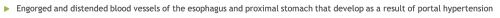 Engorged and distended blood vessels of the esophagus and proximal stomach that develop as a result of portal hypertension from cirrhosis of the liver