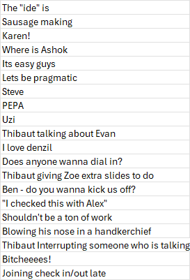 Blowing his nose in a handkerchief Lets be pragmatic Its easy guys Thibaut talking about Evan Shouldn't be a ton of work Steve I love denzil Uzi The "ide" is Does anyone wanna dial in? Thibaut Interrupting someone who is talking Thibaut giving Zoe extra slides to do Bitcheeees! Karen! Joining check in/out late "I checked this with Alex" Sausage making PEPA Ben - do you wanna kick us off? Where is Ashok Blowing his nose in a handkerchief Lets be pragmatic Its easy guys Thibaut talking about Evan Shouldn't be a ton of work Steve I love denzil Uzi The "ide" is Does anyone wanna dial in? Thibaut Interrupting someone who is talking Thibaut giving Zoe extra slides to do Bitcheeees! Karen! Joining check in/out late "I checked this with Alex" Sausage making PEPA Ben - do you wanna kick us off? Where is Ashok