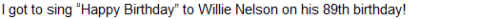 I got to sing “Happy Birthday” to Willie Nelson on his 89th birthday!