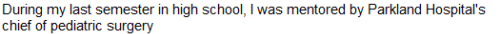 During my last semester in high school, I was mentored by Parkland Hospital's chief of pediatric surgery