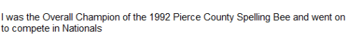 I was the Overall Champion of the 1992 Pierce County Spelling Bee and went on to compete in Nationals