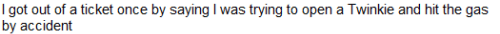 I got out of a ticket once by saying I was trying to open a Twinkie and hit the gas by accident