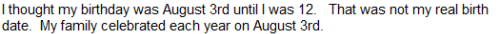 I thought my birthday was August 3rd until I was 12. That was not my real birth date. My family celebrated each year on August 3rd.