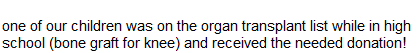 one of our children was on the organ transplant list while in high school (bone graft for knee) and received the needed donation!