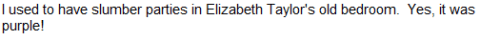 I used to have slumber parties in Elizabeth Taylor's old bedroom. Yes, it was purple!