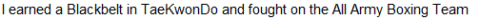 I earned a Blackbelt in TaeKwonDo and fought on the All Army Boxing Team
