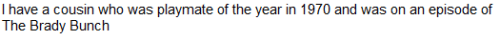 I have a cousin who was playmate of the year in 1970 and was on an episode of The Brady Bunch