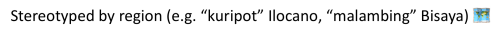 Stereotyped by region (e.g. “kuripot” Ilocano, “malambing” Bisaya) 🗺️