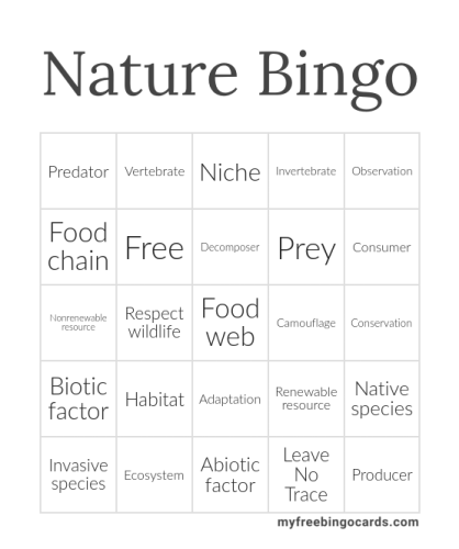 LeaveNo TraceAbioticfactorNonrenewableresourceRespectwildlifeConsumerNicheInvertebrateEcosystemObservationStewardshipCamouflageAdaptationPredatorVertebrateRenewableresourceHabitatNativespeciesBioticfactorInvasivespeciesFoodchainProducerPreyConservationDecomposer LeaveNo TraceAbioticfactorNonrenewableresourceRespectwildlifeConsumerNicheInvertebrateEcosystemObservationStewardshipCamouflageAdaptationPredatorVertebrateRenewableresourceHabitatNativespeciesBioticfactorInvasivespeciesFoodchainProducerPreyConservationDecomposer