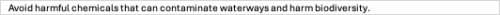 O-Avoid harmful chemicals that can contaminate waterways and harm biodiversity.