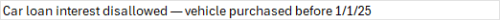 Car loan interest disallowed — vehicle purchased before 1/1/25
